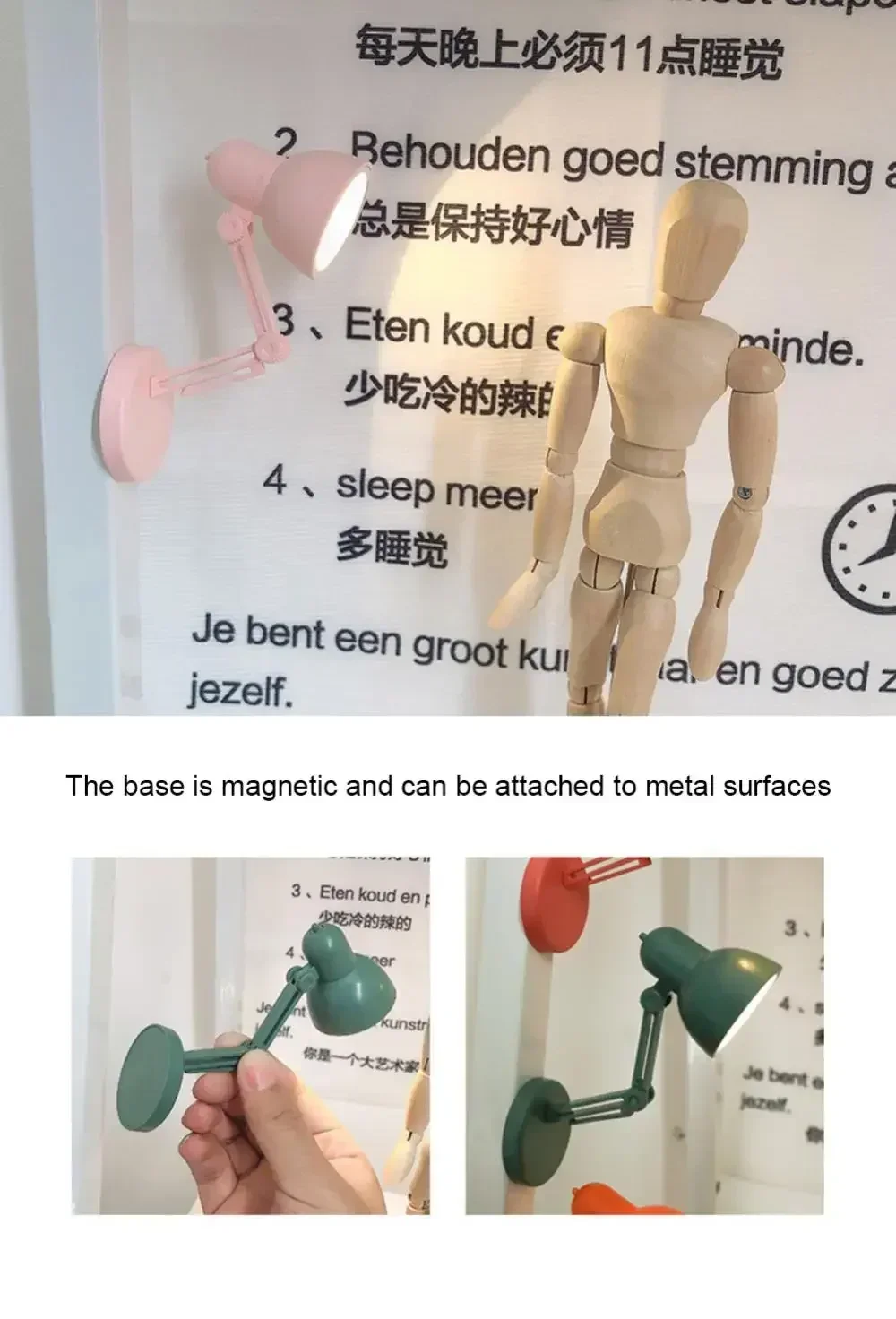 ?Magnet Design?The mini table lamp has a cute shape and a magnet on the base, which can be attached to metal places such as refrigerators and computer monitors.